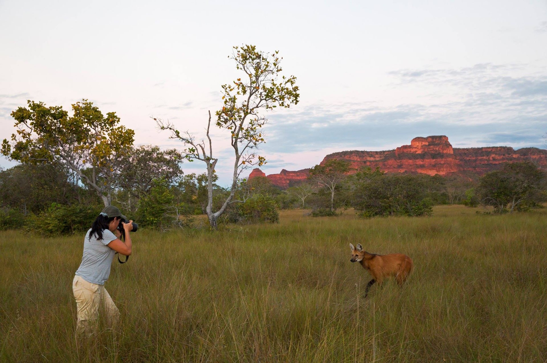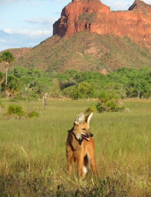The world’s tallest and most elegant wild canid is the endangered Maned Wolf of Brazil and Bolivia. From April through August, we offer guaranteed viewing of this solitary, 27-kilo (60-pound) top predator at distances of only 5-15 meters and in spectacularly-scenic savanna woodland wilderness with 1,000-foot-high red-rock cliffs.